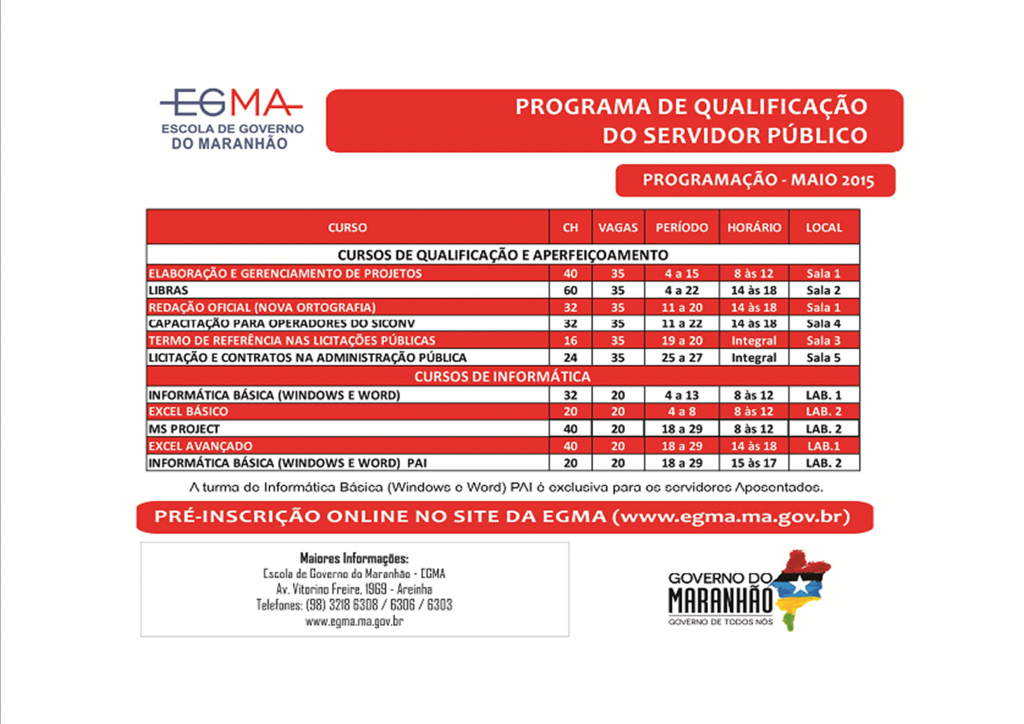 A Divisão de Capacitação da Fundação da Criança e do Adolescente informa que os cursos de qualificação oferecidos pela Escola de Governo do Estado do Maranhão (EGMA), para o mês de maio/2015 estão disponíveis no site: http://www.egma.ma.gov.br .
