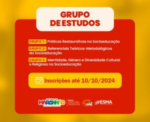 O terceiro grupo aborda Identidade, Gênero e Diversidade Cultural e Religiosa na Socioeducação, tem como objetivo aprofundar a discussão teórica e prática sobre as complexas relações entre indivíduos, instituições e a sociedade, com foco especial em temas de identidade, gênero, diversidade cultural e religiosa. “Ao fazer a inscrição, o candidato deverá escolher um dos grupos de estudo”, explica a diretora da ESMA, Priscilla Swaze.
