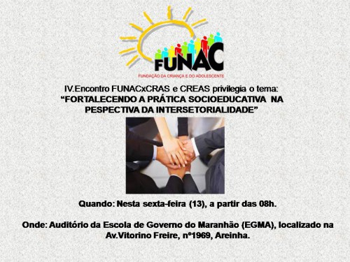 Com o tema “Fortalecendo a prática socioeducativa “, a Fundação da Criança e do Adolescente (Funac), vinculada à Secretaria de Estado de Direitos Humanos e Participação Popular (Sedihpop), realizará o IV Encontro Funac e CREAS/CRAS, nesta sexta-feira (13), das 08h às 17h, no auditório da Escola de Governo do Maranhão (EGMA), localizado na Av.Vitorino Freire, nº1969, Areinha.