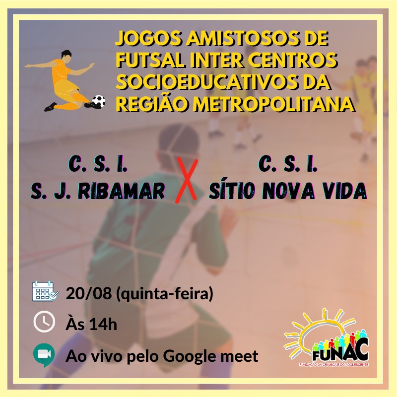 A partida do amistoso, nesta quinta (20), será entre os Centros Socioeducativos de Internação do Sítio Nova Vida e do Ribamar, que decidirão a quinta rodada com o Centro Socioeducativo de Internação do Vinhais e Canaã. A partida será transmitida pelo google meet.
