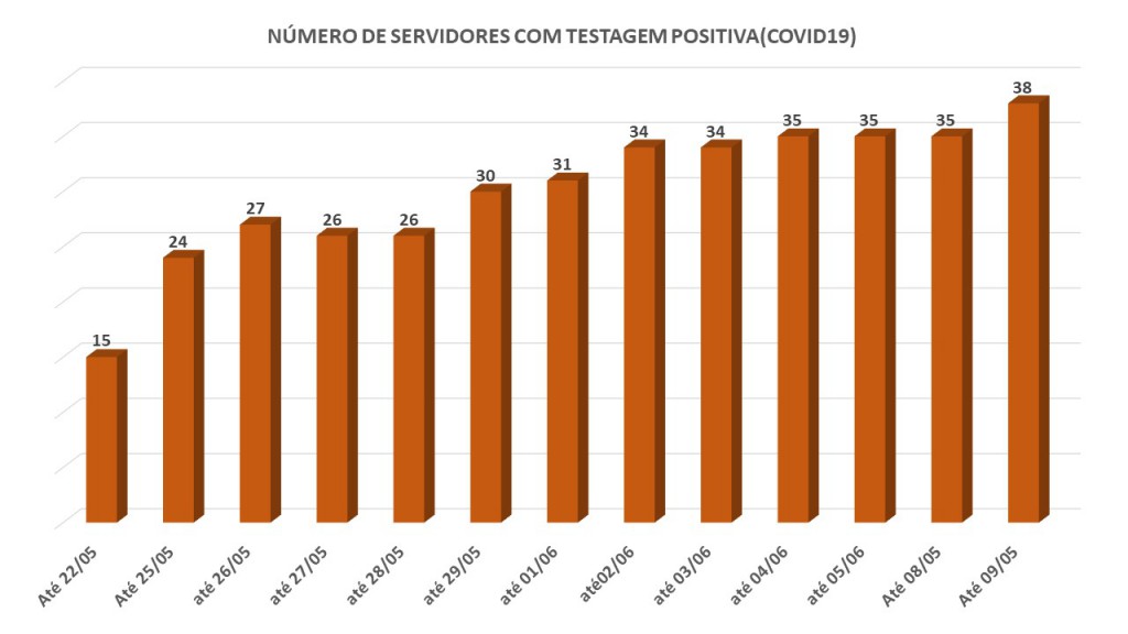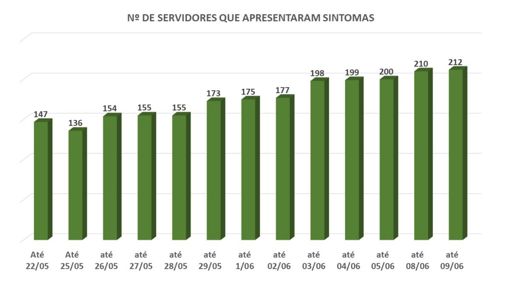 No que diz respeito aos servidores que apresentaram sintomas e se submeteram à quarentena: 51% (204) voltaram a exercer suas funções, 39%(155) permanecem em observação cumprindo o distanciamento social e 10%(38) testaram positivo para Covid-19.