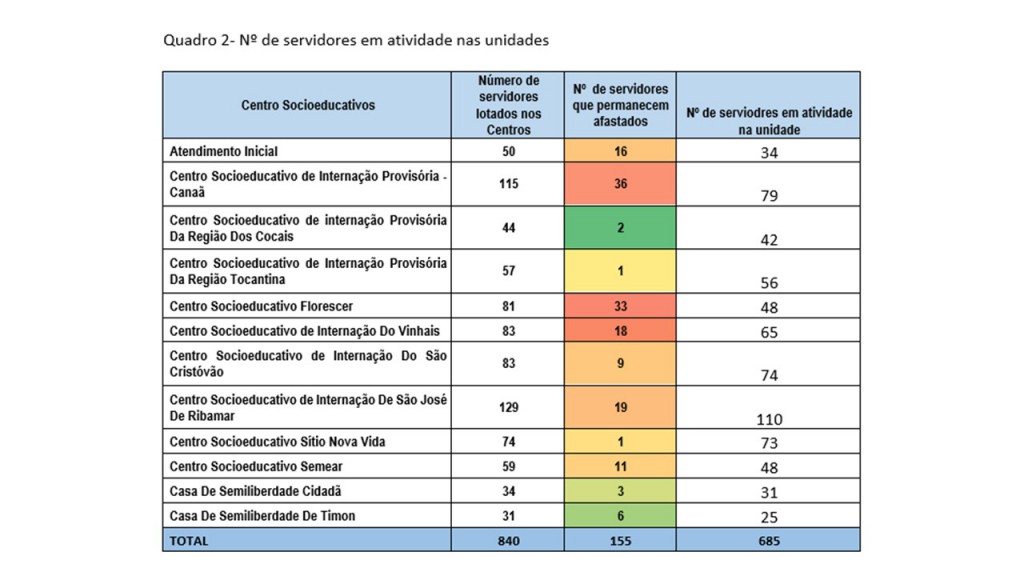 Desde a instituição do decreto Decreto Estadual Nº 35.660, de 16 de março de 2020, do Governo do Estado do Maranhão, a Fundação da Criança e do Adolescente – FUNAC, teve um total de 359 afastamentos do seu quadro de servidores das unidades de atendimento socioeducativo conforme gráfico anterior.Considerou-se os servidores pertencentes ao grupo de risco: Idosos e portadores de comorbidades / doenças crônicas (diabetes, hipertensão, asma, enfermidades hematológicas, doença renal crônica, imunodepressão – provocada pelo tratamento de condições autoimunes, como o lúpus, ou câncer e aqueles que apresentavam sintomas respiratórios e/ou febre foram afastados administrativamente por até 14 (quatorze) dias, sendo comunicada imediatamente tal ocorrência.